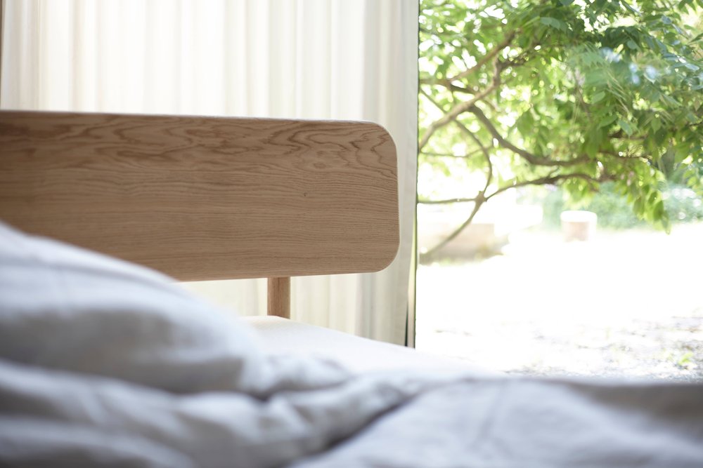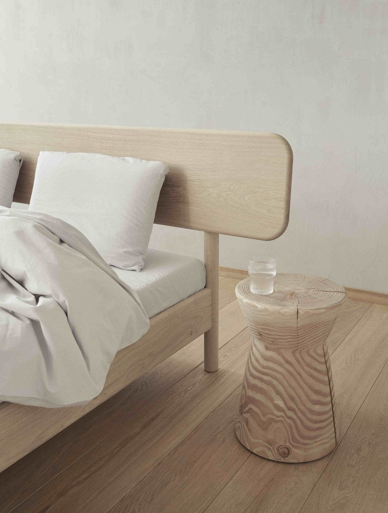 The Alken Bed Frame is a prize-winning design by Oliver & Lukas WeissKrogh, characterized by a distinctly timeless silhouette, and conceived as a tribute to sleep. The bed is made solely from solid oak, with each piece of wood going into the creation of the bed being unglued, thus preserving the well-defined grain of the oak tree. The unbroken patterns are notably highlighted in the elevated headboard, creating a meditative presence within the bedroom.