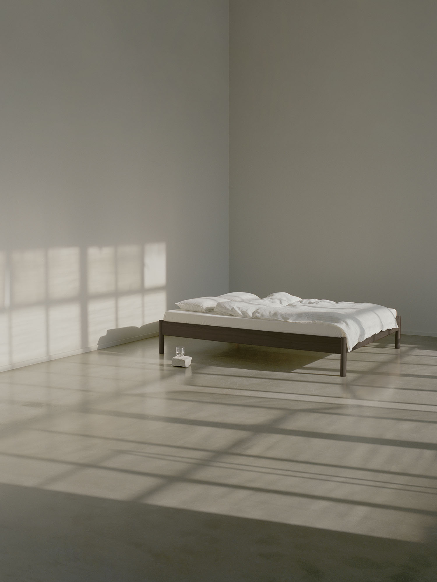 The Alken Bed Frame ex Headboard is derived from the prize-winning Alken Bed Frame. Exploring material simplicity, the design is aimed to establish a discrete refuge for the night. The bed is crafted from solid oak wood and shaped with subtle rounded edges, creating a grounding calmness within the domestic space.