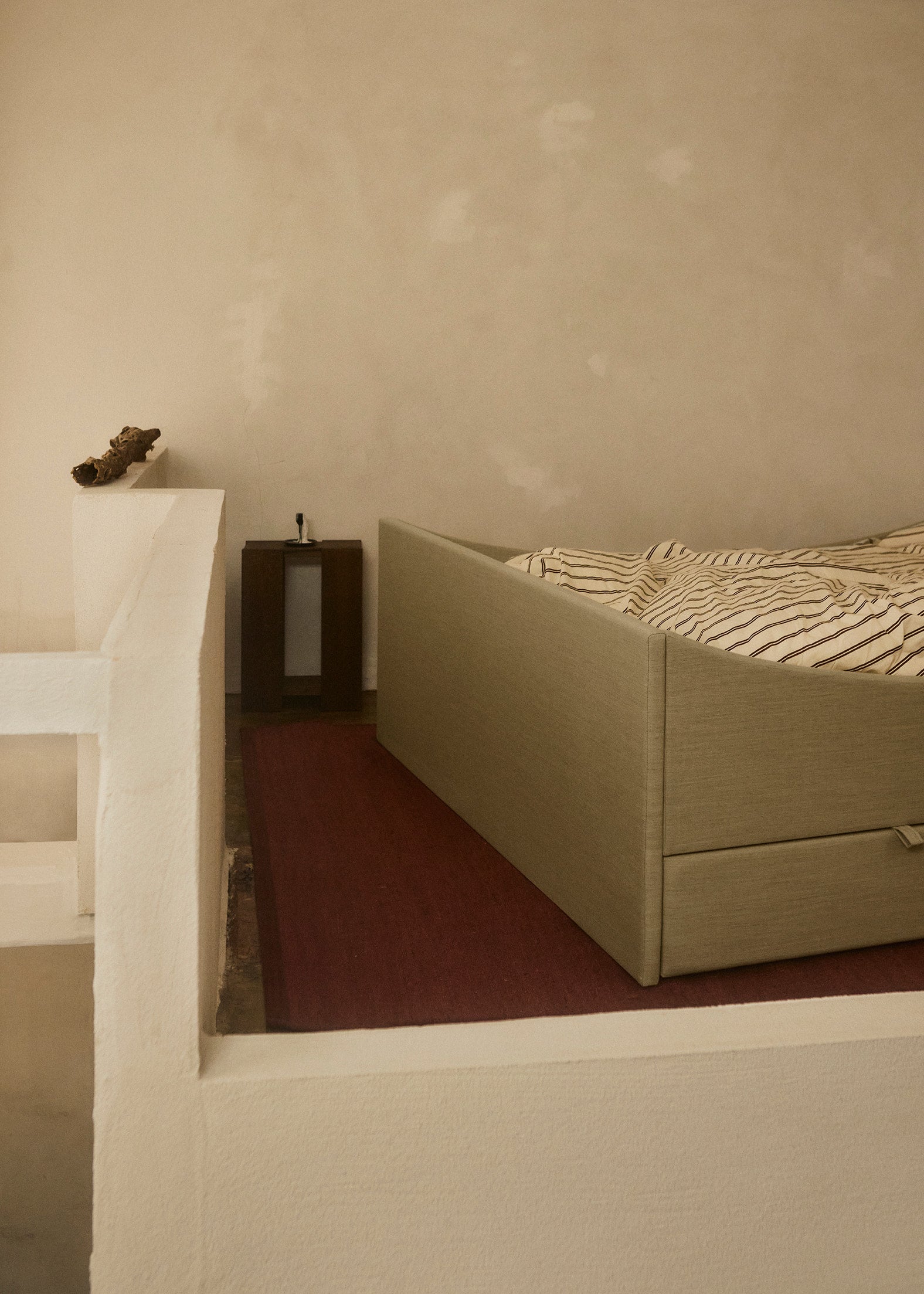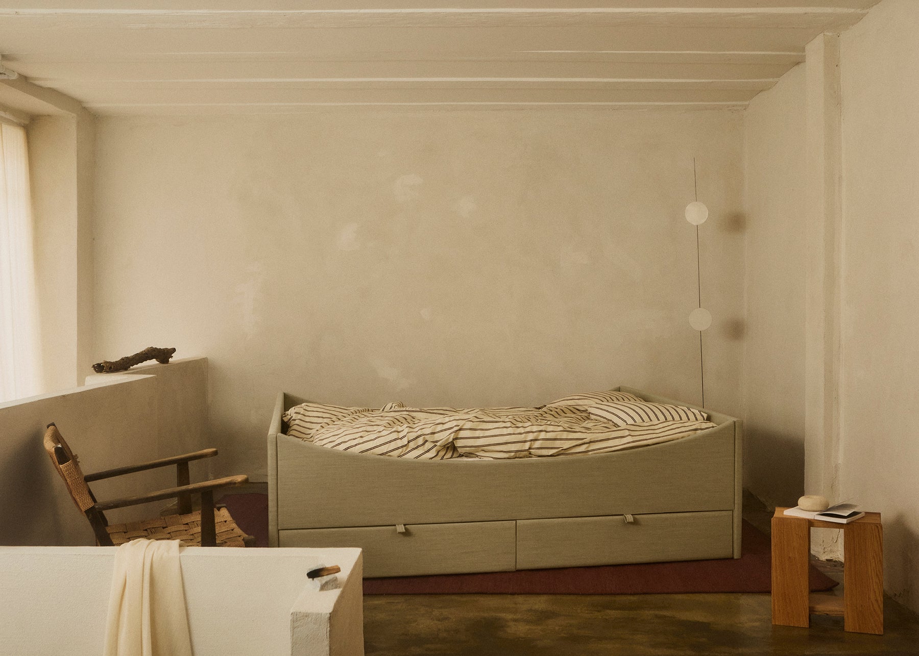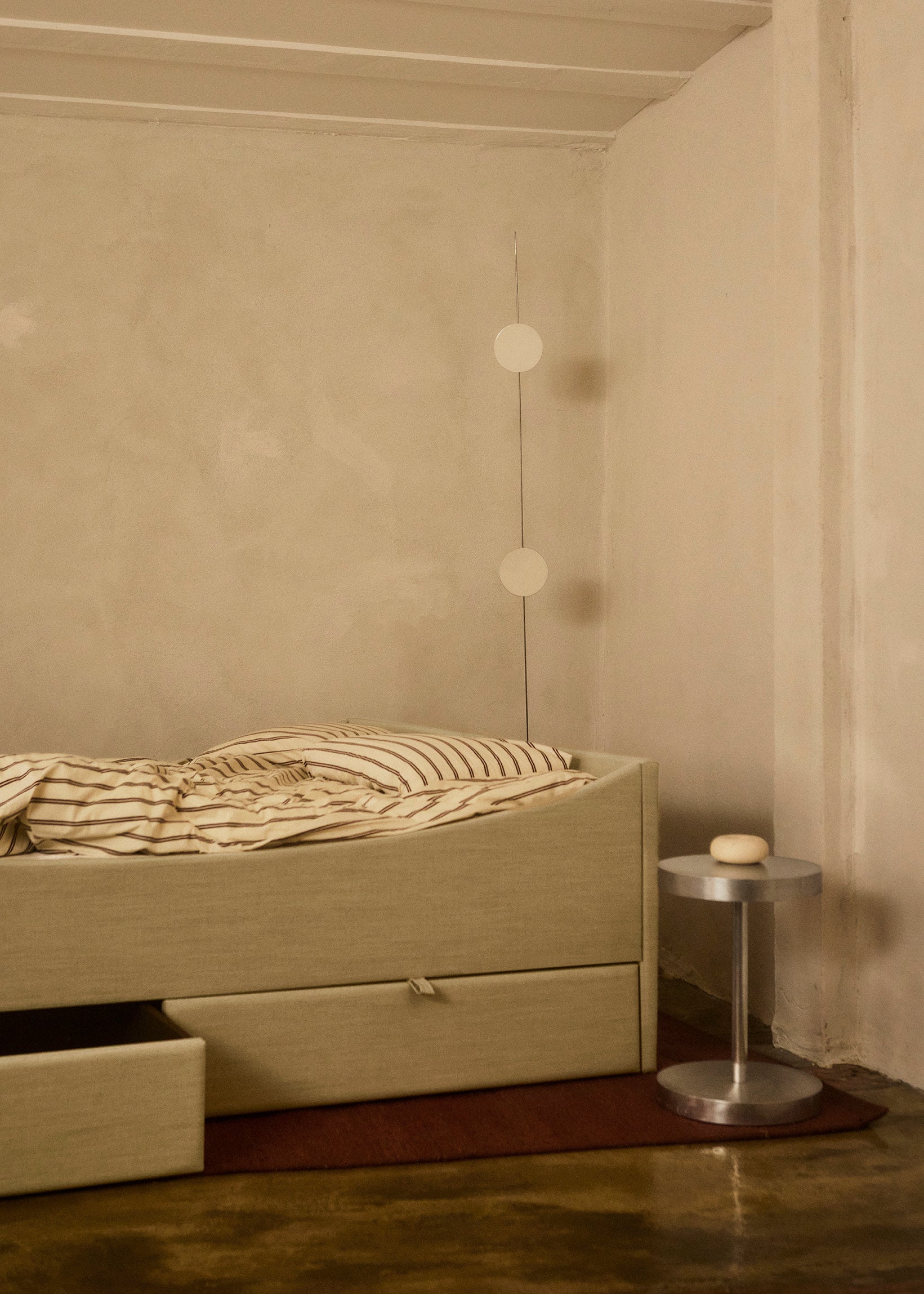 Curved Bed Frame is a delicately refined piece of bedroom furniture with an enduring aesthetic, that lends itself to both traditional and contemporary principles. Designed by Studio 0405, Curved Bed Frame is upholstered with a tightly woven wool fabric and features an elegant curve along each of its sides - a nod to the venerable French Lit Bateaux typology - creating a nest-like comfort within the bed. Optional upholstered drawers beneath the bed are available, for an elevated storage concept.