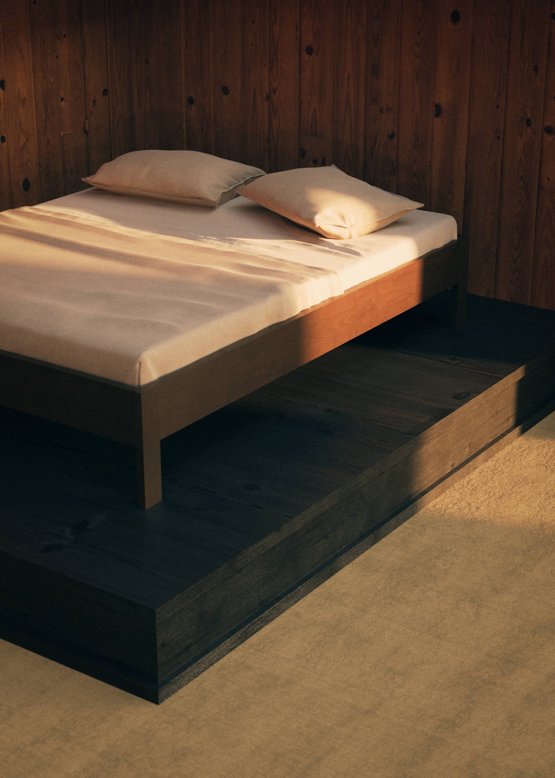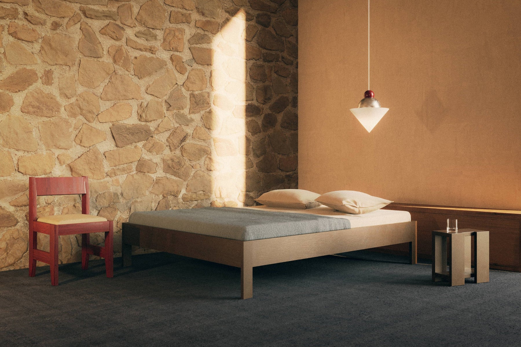 Ejer ex Headboard Bed Frame explores a deeply ascetic principle - the conscious renunciation of excess functionality. Stripped to the bare essentials, a simple combination of a low horizontal profile with a vertical leg structure emerges to define an archetypical figure of a carried frame.