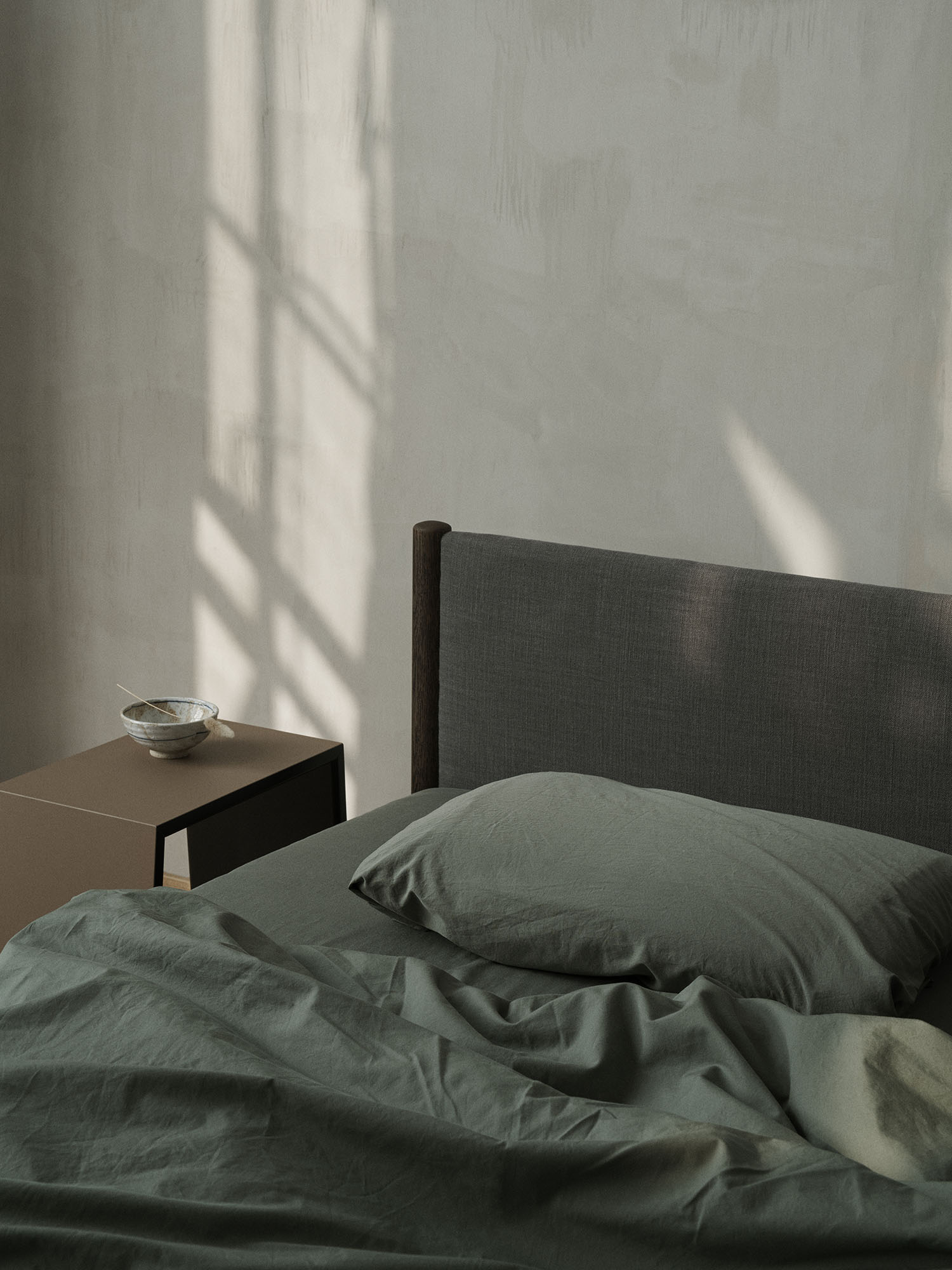 Designed by Oliver and Lukas WeissKrogh, the Veng Bed Frame presents a reimagination of the traditional upholstery bed. Outlined by a lower profile the bed frame features a linen textile, whose inviting tactility is complimented by bed posts of solid oak wood, subtly anchoring the framework.